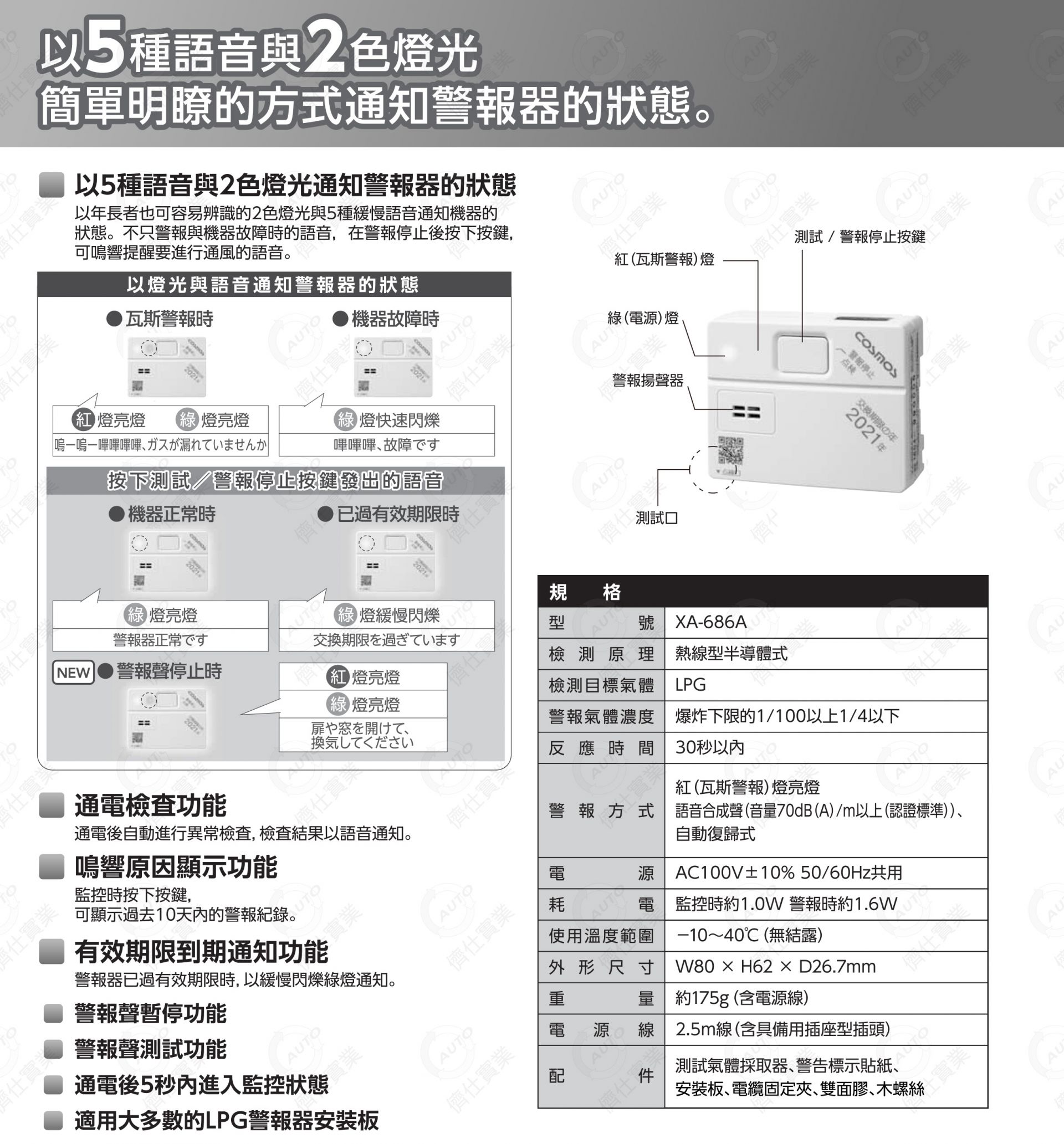 電源式、AC交流電、LPG、桶裝瓦斯、瓦斯熄火、忘記關火、瓦斯熱水器、小巧輕量、潔白/美型設計、外型簡約/簡潔設計、不破壞裝潢、吊掛/壁掛式、無痕掛勾、背膠、輕隔間、石膏板、燈光不刺眼、大警報聲、燈光不刺眼、大警報聲、熱線型半導體式、自檢/測試/警報聲停止(暫停)/有效期過期提醒功能、語音發報、日語語音、蜂鳴警報、語音發報、日語語音、蜂鳴警報、5年壽命、廚房、高級住宅、大樓、公寓、社區、租屋、套房、房東、露營、帳篷、客廳帳、餐廳、小吃店、幼兒園、50KG以上串聯、瓦斯公司使用/首選品牌、日本大廠、100%日本製造、台灣/日本市佔率第一、日本全新/先進技術、瓦斯警報器領導者、世界創新品牌、感應器、感測器、傳感器、世界首創、故障通知、長輩/高齡/老人/年長者可聽見/察覺、備用插座插頭、不占插座、秒速開機、大眾款、高CP值、緩慢警報聲、降低/減少緊張情緒、瓦斯爆炸、瓦斯氣爆。